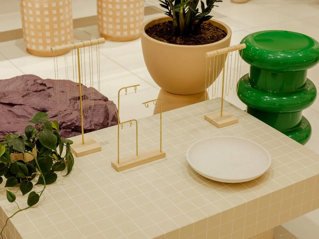 Le concept met de l’avant la matérialité ainsi que la couleur. Un doux mélange combinant la transparence, le lustre/mat et la réflection. Une mise en marché singulière comprenant des items choquants permet de contraster avec la délicatesse des bijoux. La mousse mémoire et les roches peintes apportent un élément de surprise qui fait du bien.